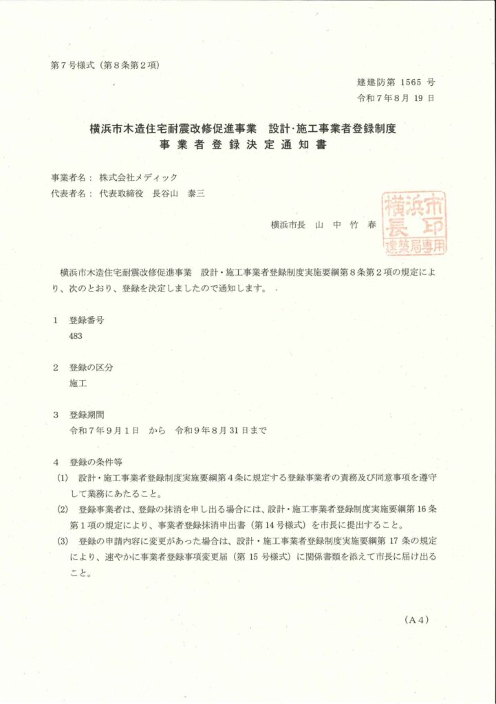 横浜市の木造住宅耐震改修促進事業の助成金の対象となる木造住宅で、横浜市の無料の耐震一般診断を受け、建築基準法の上部構造評点1.0未満となった建物で、横浜市の助成金を受けようとする木造住宅の耐震改修の施工区分の事業者登録の更新をしました。