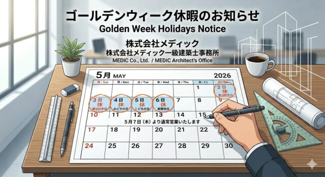 ゴールデンウィーク休暇のお知らせ お知らせ 2026年04月22日 本年のゴールデンウィーク休暇のお知らせです。 株式会社メディック、株式会社メディック一級建築士事務所は、5月2日土曜日より5月6日水曜日までの5日間、ゴールデンウィーク休暇とさせていただきます。 5月7日(木)より通常営業とさせていただきます。 なお、4月25日(土)、26日(日)、4月29日(水・祝日:昭和の日)は休業日とさせていただきます。 ゴールデン休暇中のお問い合わせ、ご相談は、ご相談窓口にて承りますのでよろしくお願いいたします。 一覧へ Next »